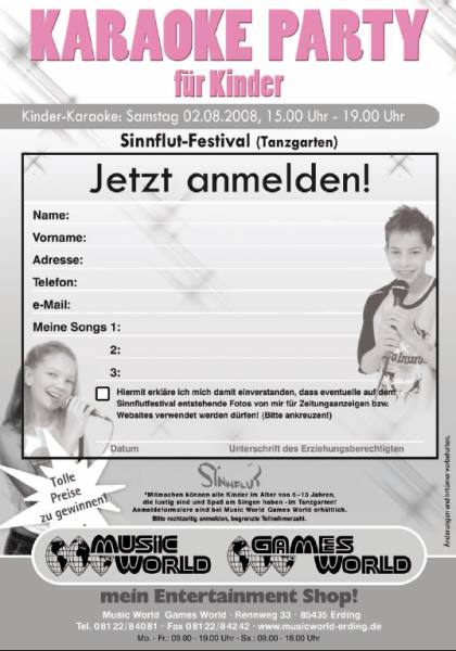 Aufgrund des großen Erfolges vom Vorjahr 2007 wird neben der Erwachsenen-Karaoke am 03.08., auch am Samstag den 02. 08. ab 15:00 die Kinderkaraoke wieder an den Start gehen. Auch hier ist es uns gelungen eine hochkarätige Jury zusammenzustellen.